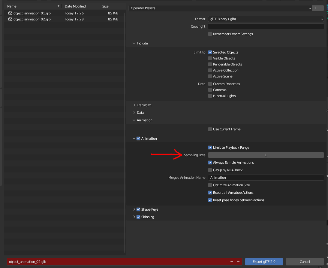 Sampling is a good way to optimize the animation. The sampling rate will define how often a keyframe will be baked in the animation. For example, if the sampling rate is set to 2, that means a keyframe will be created at every two frames. A sampling rate of 3 will bake a keyframe every three frames and so on. The higher the sampling rate, the lighter the file.