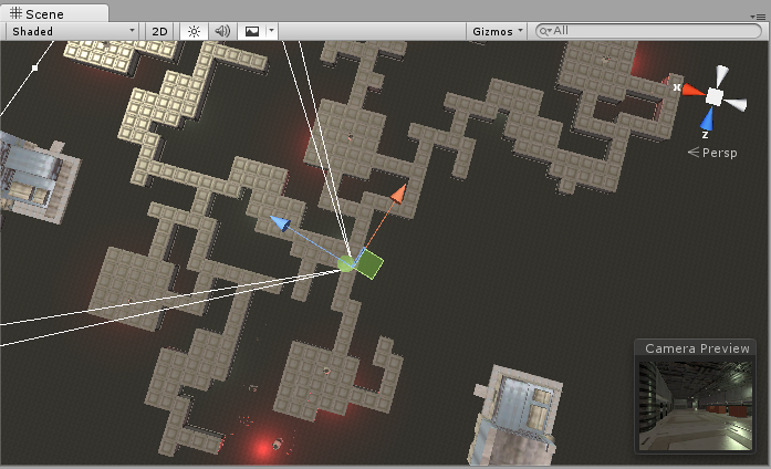 A maze-like indoor level. This normal scene view shows all visible Game Objects.