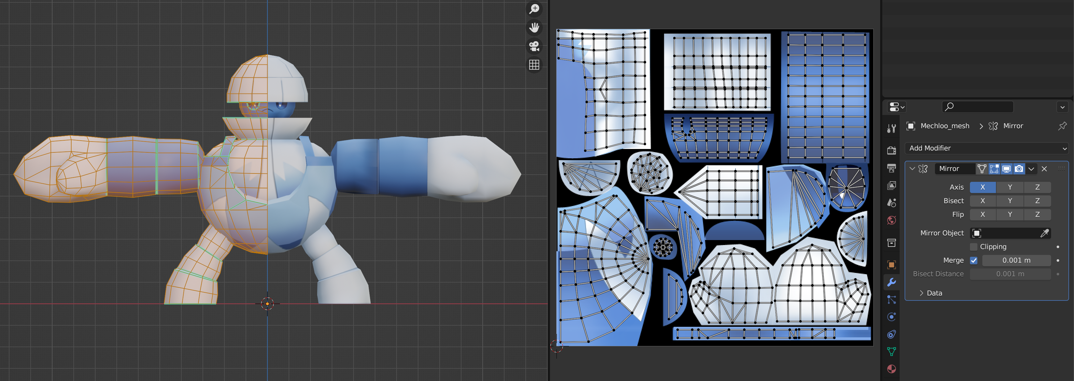 The Mirror Modifier in Blender is a tool used for creating symmetrical models by mirroring one half of an object to any direction (X,Y,Z). It’s a great tool when you have symetrical models because it reduces the time of 3D modeling, doing UV Unwrapping (because you will need only to unwrapp one part of the model and the rest will share the same UV coordinates) and also optimize your textures avoiding wasting texture resolution on parts that are essentially mirrored.