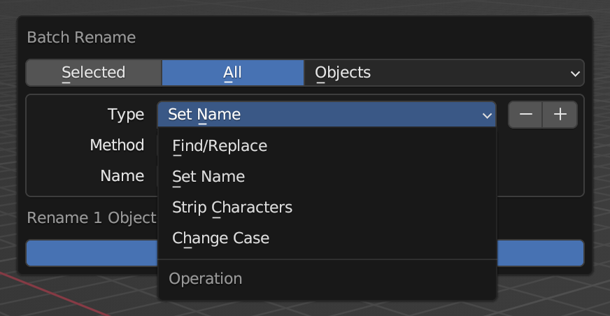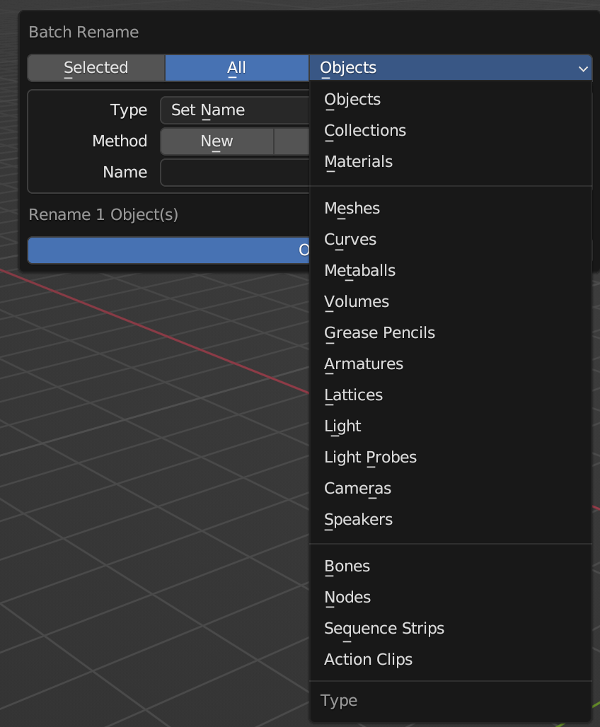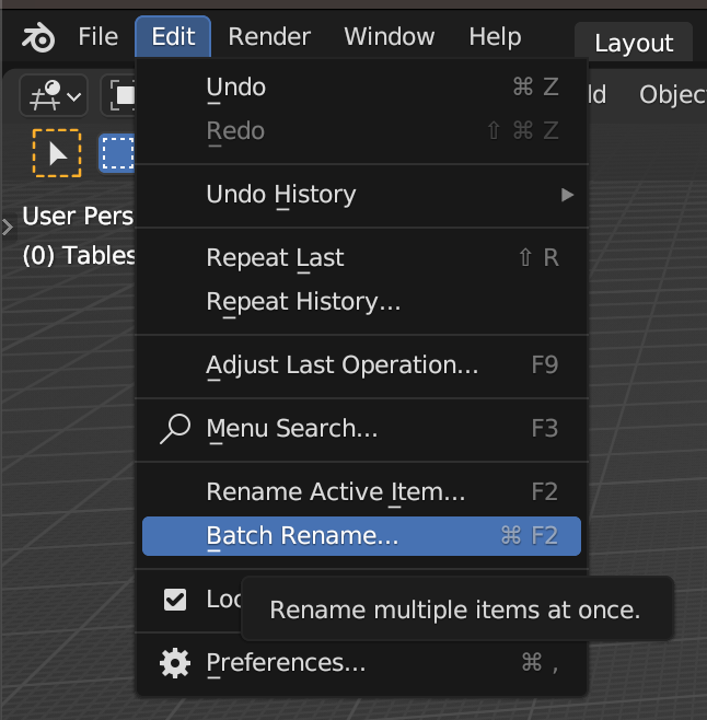 A very handy tool to change name conventions in an easy way is using the Batch Rename that Blender has integrated in their toolkit. To access it go to Edit and then Batch Rename.