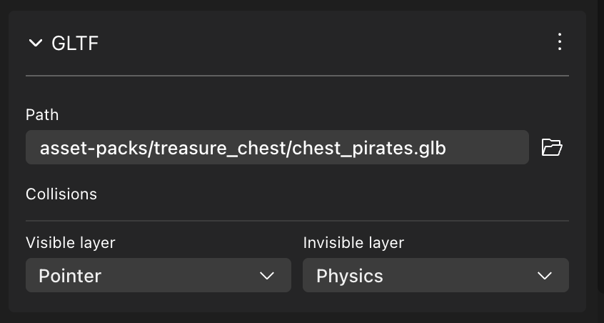 By default, the visible geometry of a GLTFContainer isn’t mapped to any collision layers, but the invisible geometry affects both the Physics and the Pointer layers. You can change this value to only affect one, or neither, and to affect custom layers instead. You can also configure the visible geometry layer in the same way.