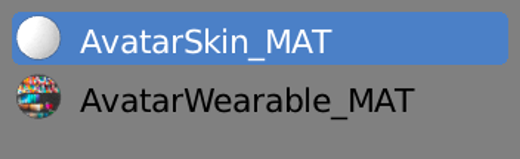 There are three basic materials for avatar models. One is the material used for the wearable itself, another one is used for the skin and another one for the eyebrows, eyes and mouth.