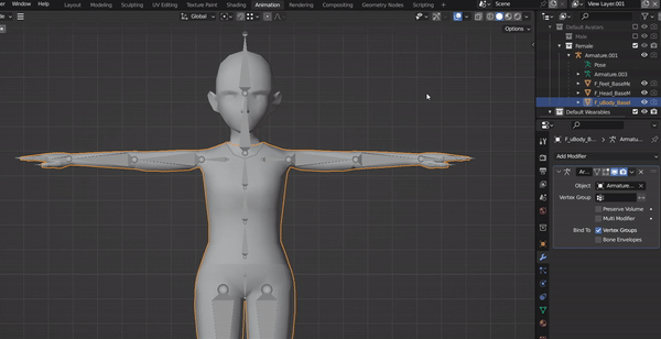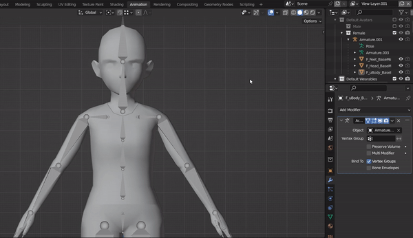 You’ll notice that each model contains 8 different meshes related to an armature. These meshes represent the head, eyebrows, eyes, mouth, upper body, lower body, hands and feet. You can use these example models as a reference and starting point for your own custom wearable.