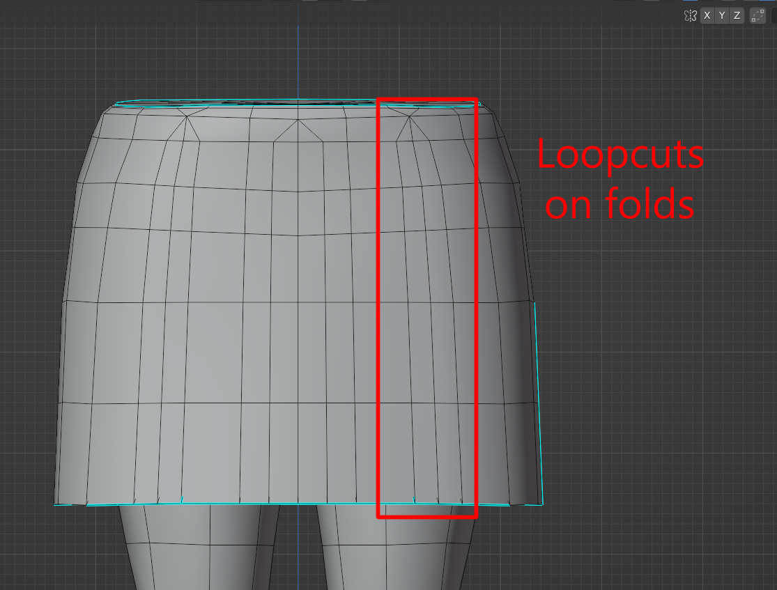 A useful tip and good practice when modeling skirts/dresses is to add additional loopcuts in the intersections of the folds. This will be very handy when you have to paint the weights of the rig.