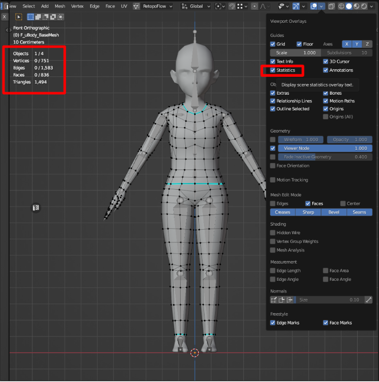 A valuable tip is to always keep on track of the polycount of your models. To do that in blender you need to turn on statistics on the viewport overlays panel.