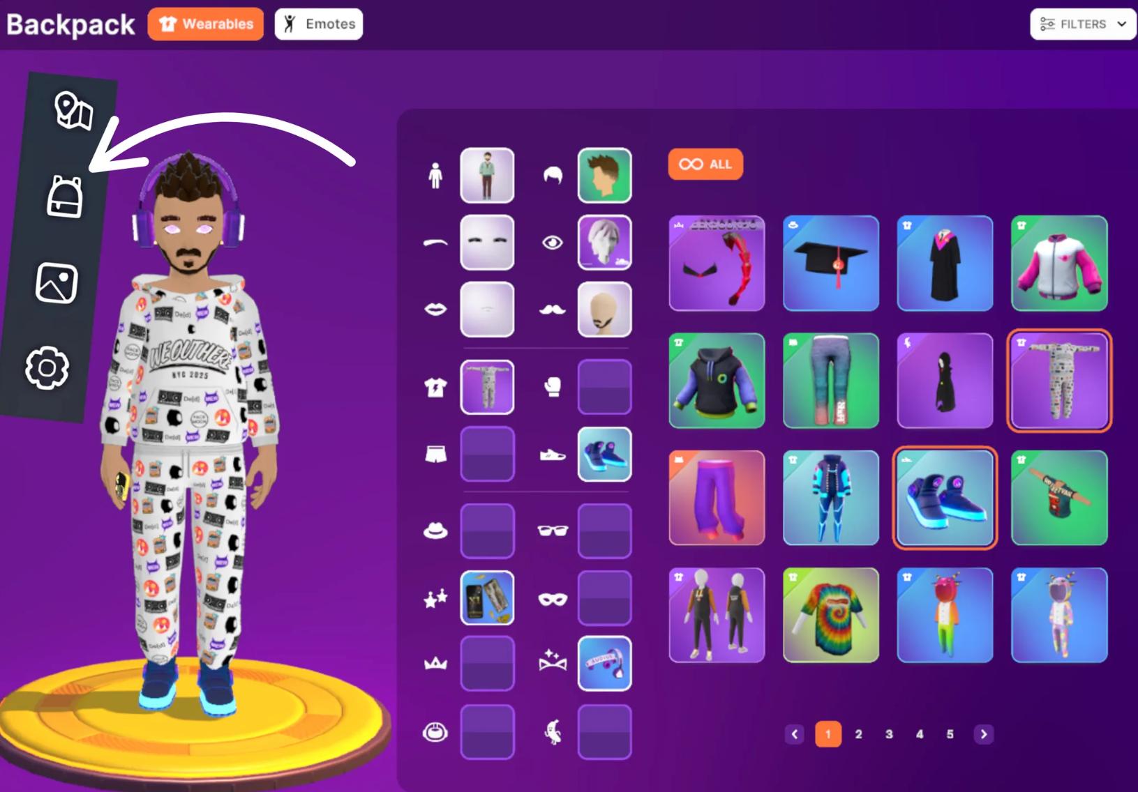Edit your avatar’s appearance in the Backpack. Look for a backpack icon in the sidebar menu. Here you can change your avatar’s body features and attire.