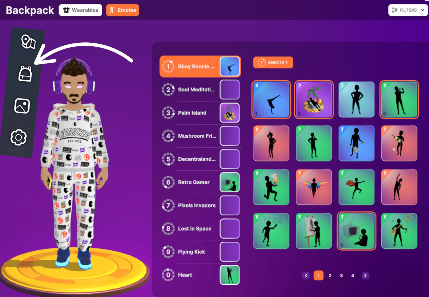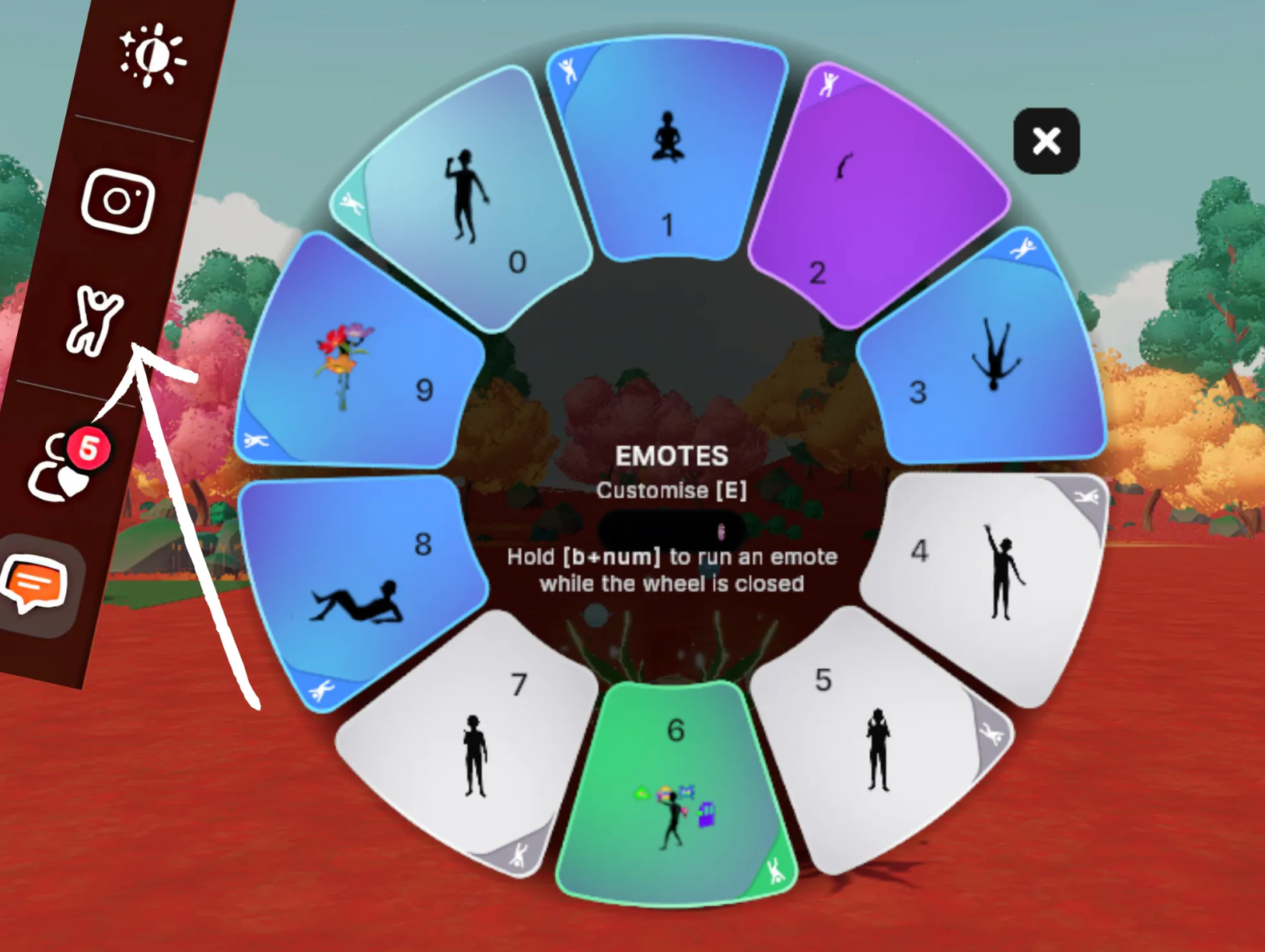 Emotes are animations that allow your avatar to express reactions, perform dance moves, or engage in activities such as yoga or painting. You can trigger them from the Emote Wheel when you press ‘B’ or click on the dancing figure icon in the sidebar menu.