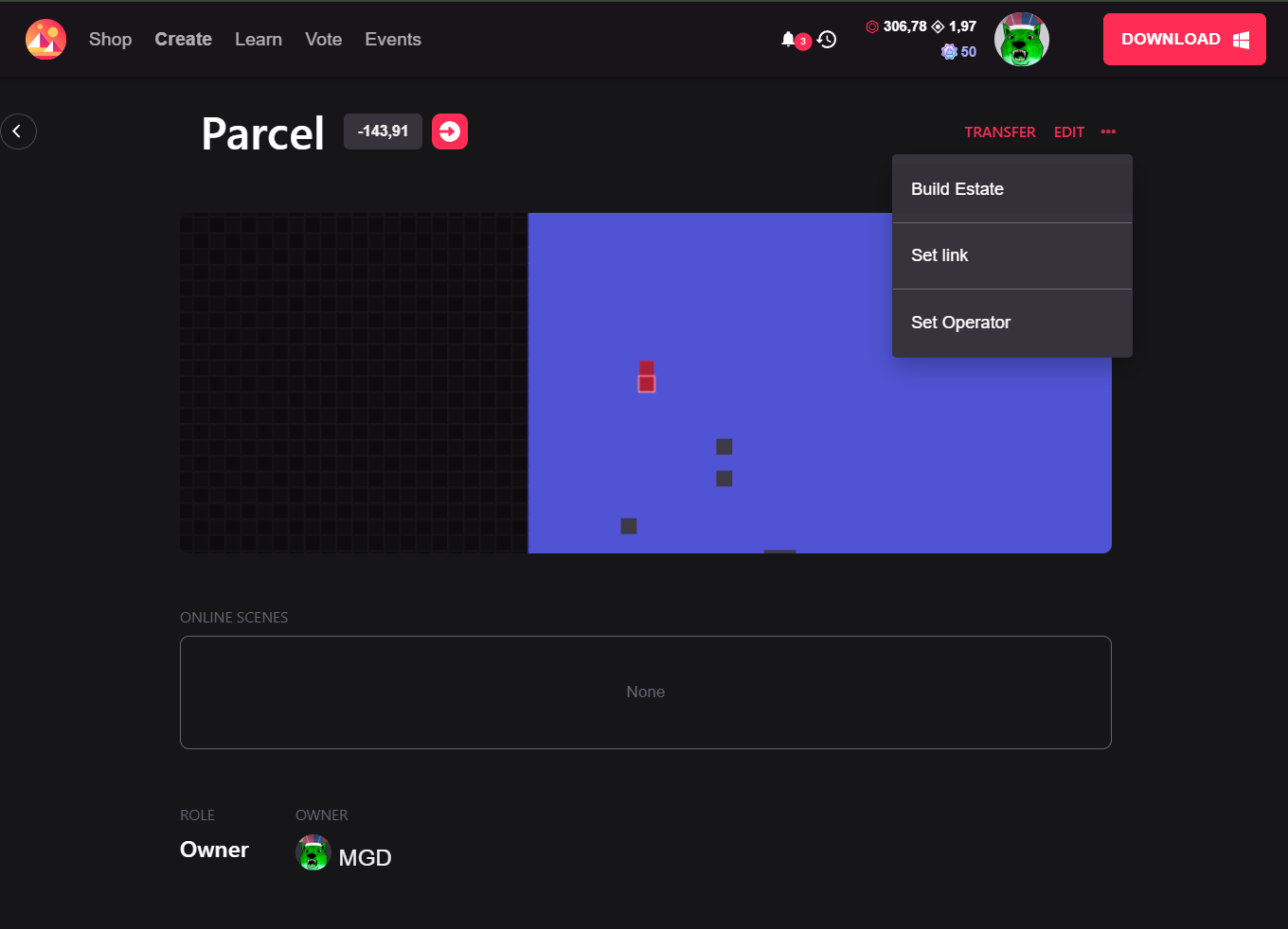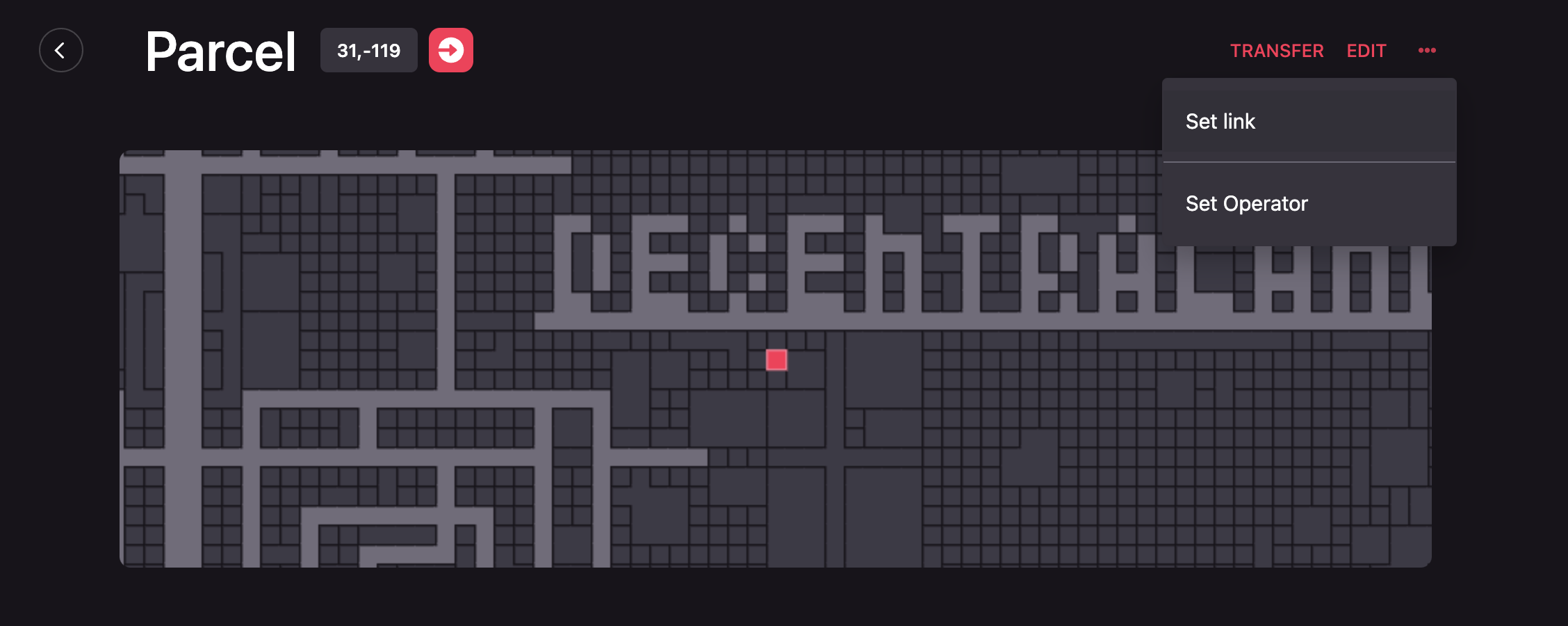 By clicking on one of the parcels or Estates listed under Land, you can edit its name, description, set an operator, or transfer it directly to another wallet address.